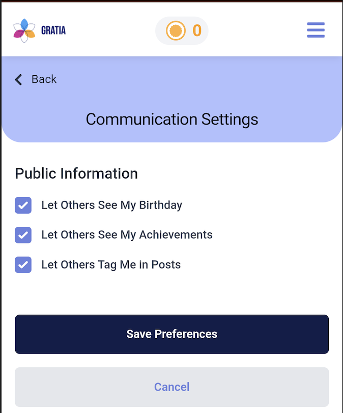 You can also change your communication settings. To access your menu, click the (☰) in the top right corner of the home page. Click your Shoutouts Feed and click the wheel icon. Check/Uncheck preferences and click Save Preferences.
